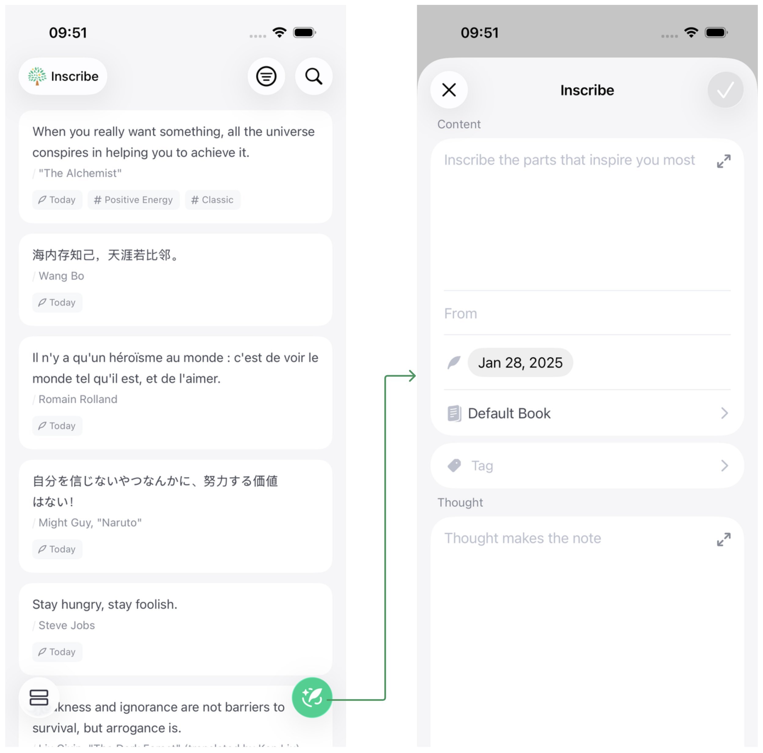Inscribe is a simple and intuitive tool for collecting and reflecting on inspiring words. You can easily capture meaningful quotes anytime, anywhere — and take it a step further by adding your own thoughts, then look back anytime.