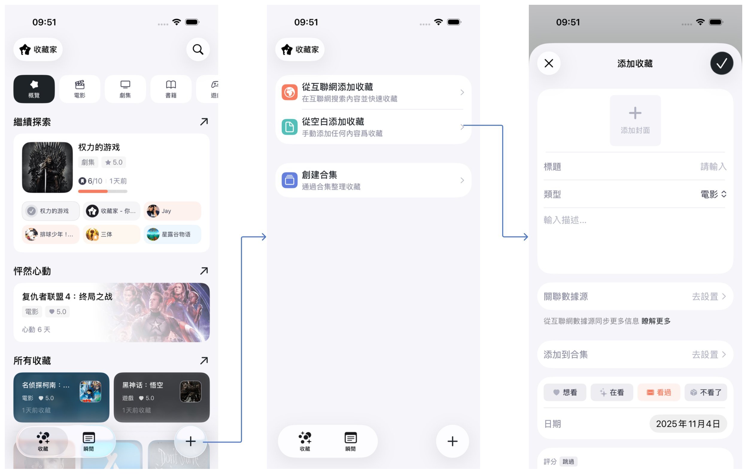 收藏家可以讓你基於互聯網數據添加收藏,目前支持的數據源有: NeoDB、TMDb、Bangumi、App Store。